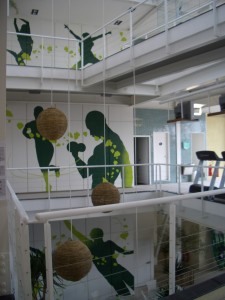 Vale ressaltar que, ao mesmo tempo em que dividimos o micro, devemos unificar o macro, ou seja, usar elementos que formem uma identidade percebida em todos os ambientes. Nos dois projetos citados, a iluminação e a repetição de texturas e cores foram os elementos responsáveis por reforçar a noção global que o aluno deve ter, estando em qualquer dos andares. Outra técnica que usamos para manter a unidade visual destas academias verticais é criar grandes vazios, pois eles ajudam na visualização do todo, como no projeto da academia de dança, Pulsarte. Também é necessário pensar em um ponto de circulação vertical como escadas, elevadores e rampas. Nos projetos assinados por nosso escritório pensamos em escadas amplas e convidativas, que integram e indicam os diferentes níveis da estrutura do prédio.  É importante sinalizar também que a academia deve ser acessível para portadores de necessidades especiais e pessoas com limitações temporárias, por isso muita atenção no planejamento dos investimentos e nos projetos.